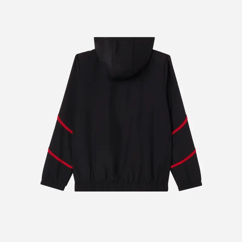 AC Milan kid’s zippered jacket from the Prematch 2025 collection with a red and black pattern.